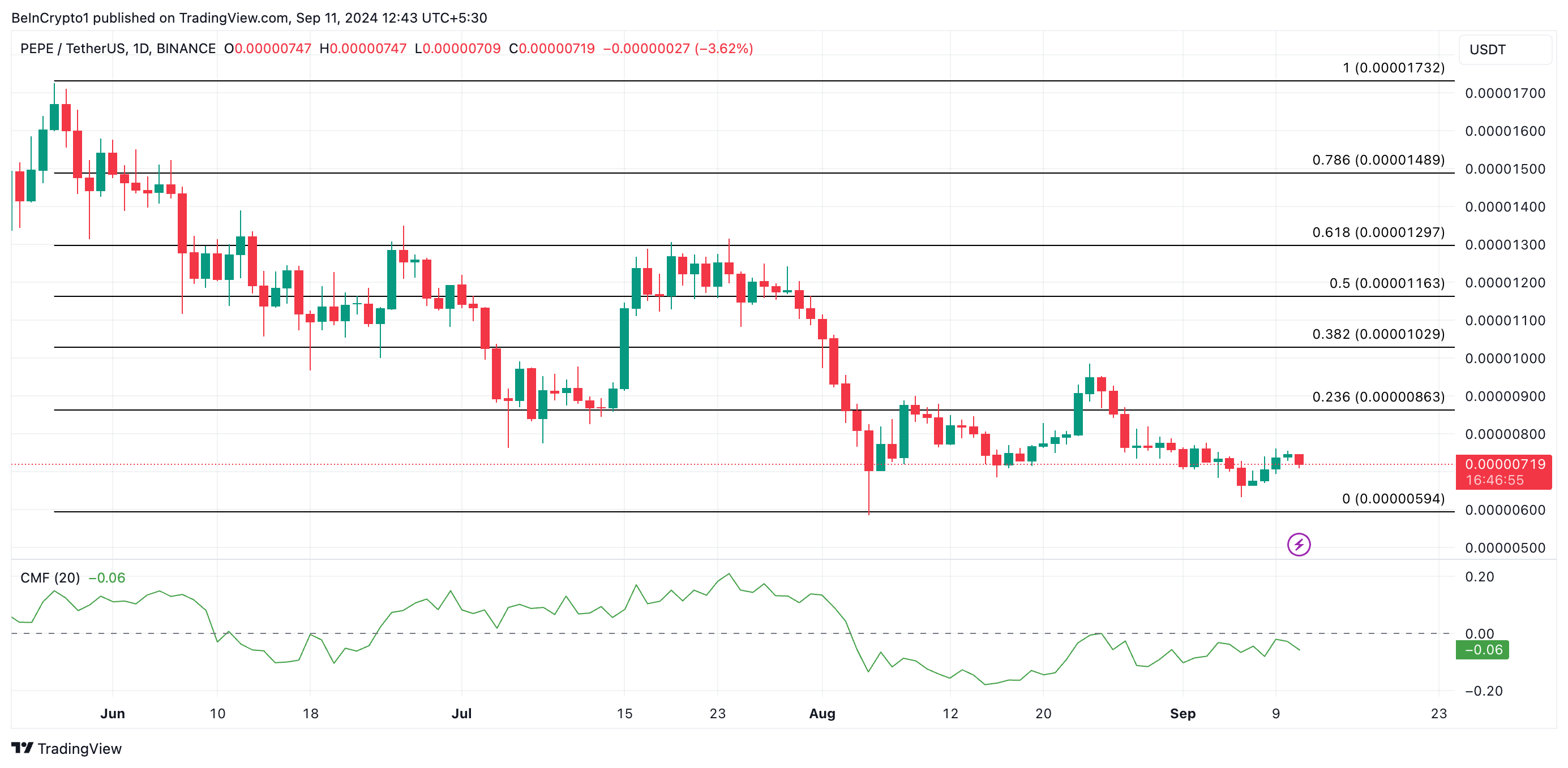 Spadający wskaźnik przepływu pieniędzy Chaikina (CMF) dla PEPE dodatkowo potwierdza zmniejszone presję kupujących. Obecnie CMF, który śledzi przepływ kapitału do i z rynku, jest poniżej zera i ma tendencję spadkową, co sygnalizuje słabość rynku i zwiększone wyjście płynności.