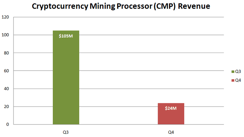 Po stwierdzeniu, że ma ograniczoną widoczność tego, w jakim stopniu wydobycie kryptowalut wpływa na ogólny popyt na GPU, raport odnotowuje, że przychody z procesorów do wydobywania kryptowalut spadły do 24 milionów dolarów w kwartale, co stanowi spadek z 105 milionów dolarów w poprzednim kwartale. Całkowity przychód dla tego strumienia wyniósł 550 milionów dolarów.