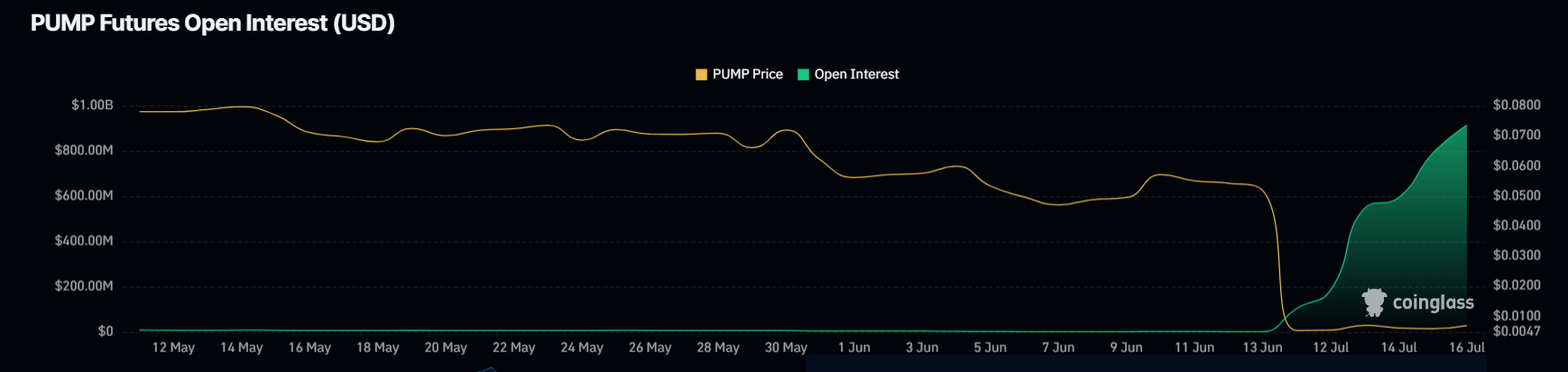 Tymczasem makro dynamika stojąca za Pump.Fun jest niezaprzeczalna. Szczególnie na rynku instrumentów pochodnych. Wartość jego otwartych pozycji PUMP zbliża się do 913 mln USD. Co wiecęj, jest na dobrej drodze do osiągnięcia 1 mld USD do trzeciego dnia od debiutu.