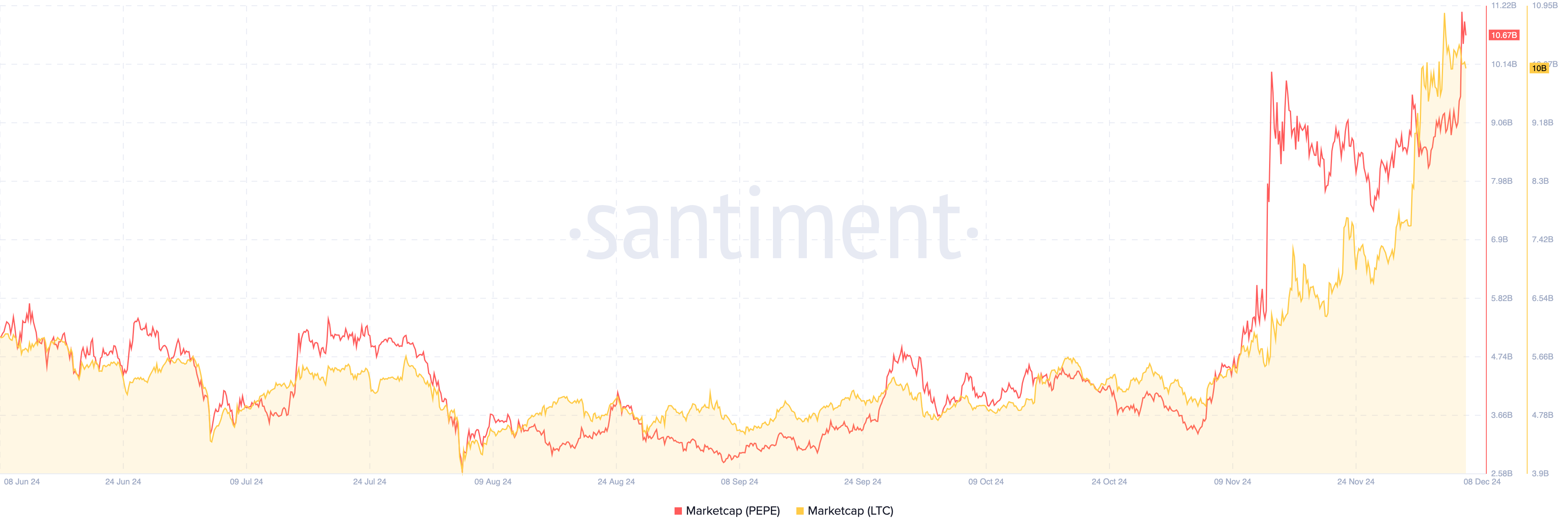 Pepe (PEPE) to popularny memecoin z motywem żaby, który osiągnął znaczący kamień milowy, przekraczając po raz pierwszy kapitalizację rynkową 10 mld USD. Z kolei to spowodowało, że PEPE wyprzedził Litecoin w rankingu kapitalizacji rynkowej. Stało się to, kiedy cena PEPE wzrosła o 18% w ciągu ostatnich 24 godzin, osiągając chwilowo nowy rekord wszech czasów.