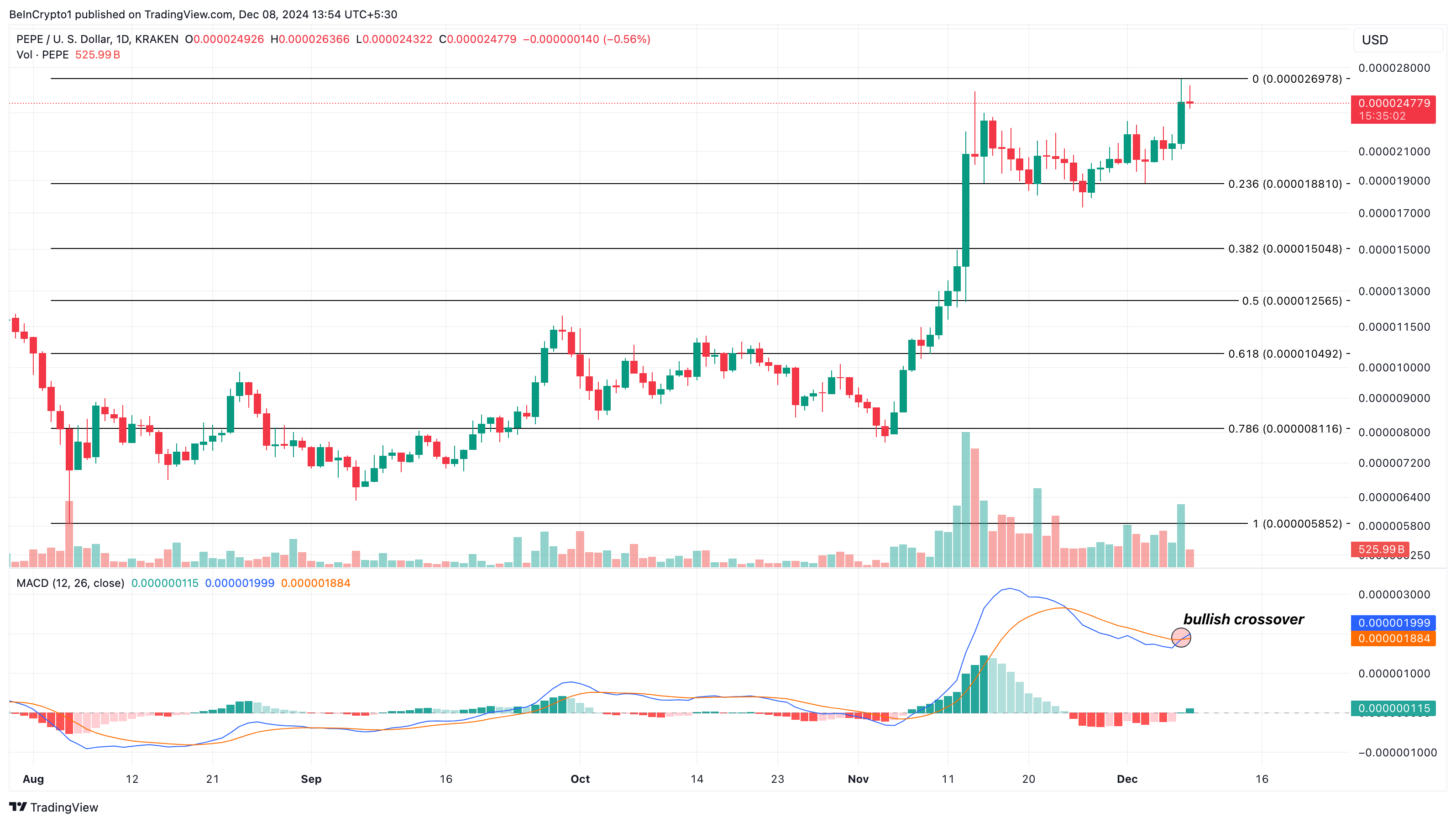 SponsoredWzrost tych wskaźników sygnalizuje większe zaangażowanie użytkowników i byczy impet. Jeśli te nastroje utrzymają się, PEPE może nie mieć nic na przeszkodzie w odzyskaniu swojego rekordu wszech czasów (ATH) i potencjalnie zobaczyć dalsze wzrosty cen.