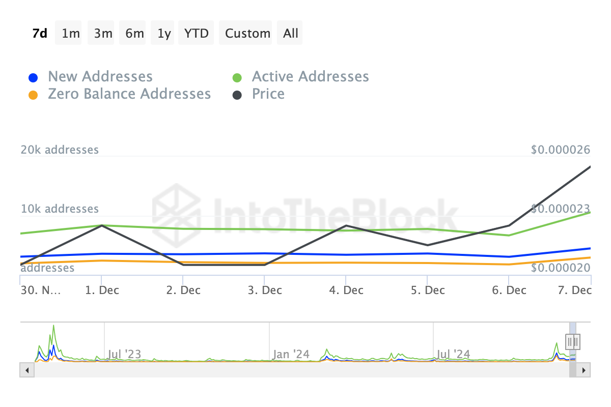 Tymczasem, analiza BeInCrypto ujawnia, że ten ostatni sukces odnośnie rankingu kapitalizacji rynkowej dla PEPE można przypisać znacznemu wzrostowi aktywności sieciowej. Dane z IntoTheBlock podkreślają wzrost zarówno aktywnych, nowych i zerowych adresów. Są to kluczowe wskaźniki wskazujące na rosnący popyt na token.