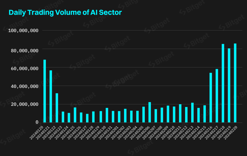 W ubiegłym tygodniu dane Bitget wykazały wzrost wolumenu obrotu o 361% w ich Strefie AI i 136% wzrost dziennych użytkowników handlowych w tej samej strefie. Ponadto, średnia kapitalizacja rynkowa w strefie AI Bitget w lutym odnotowała 58% wzrost w porównaniu do stycznia.