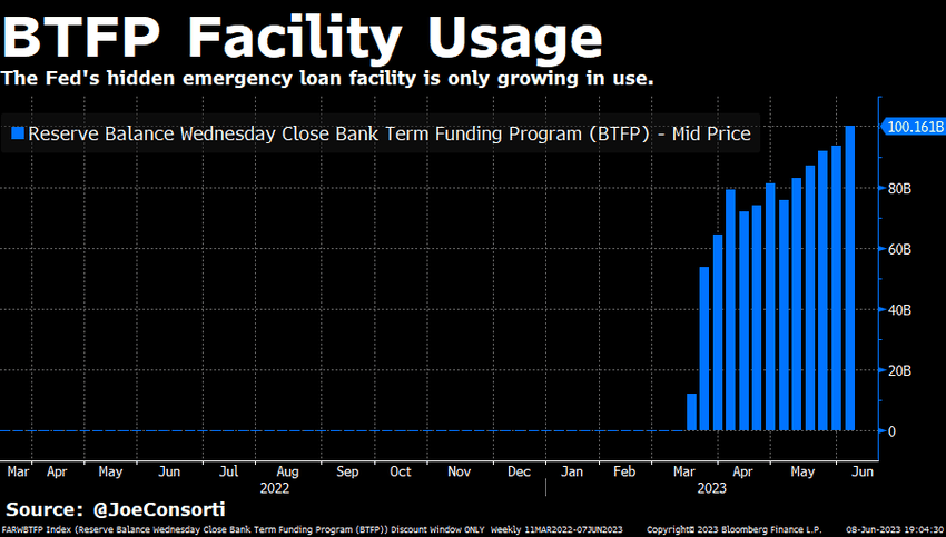 “Program awaryjnego finansowania banków (BTFP), który Fed wymyślił na własną rękę i powiedział Kongresowi, że nie przekroczy 25 miliardów dolarów, wynosi obecnie ponad 100 miliardów dolarów.”