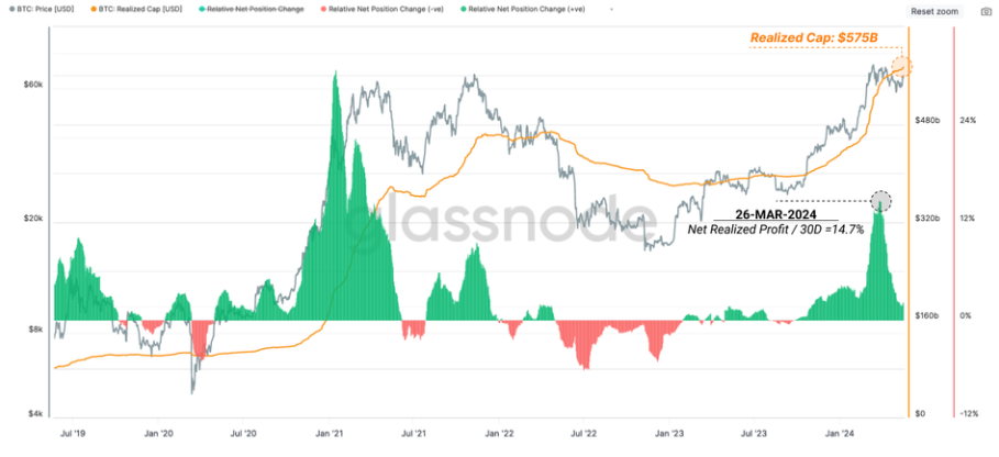 Pomimo że wartość zrealizowanej podaży nadal rośnie i osiąga nowe maksima, tempo tego wzrostu jest znacznie wolniejsze niż w poprzednich miesiącach. To sugeruje, że nowy kapitał napływający do sieci Bitcoin zmniejszył się, co może być wynikiem spadku zainteresowania inwestorów. Zmniejszona prędkość napływu nowego kapitału może wskazywać na ostrożniejsze podejście inwestorów do zakupu Bitcoinów po wyższych cenach.