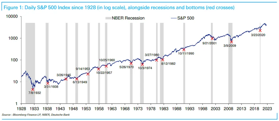 Pod tym względem zwiększone prawdopodobieństwo recesji nie jest dobre dla cen ryzykownych aktywów. Widzimy to świetnie w wynikach Bitcoina w ostatnich miesiącach. Z drugiej strony, na tym wykresie od razu widać, że rynkowi (jak dotąd) zawsze udawało się wyjść z recesji – przynajmniej w przypadku S&P 500.