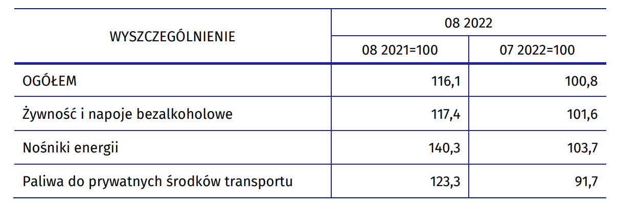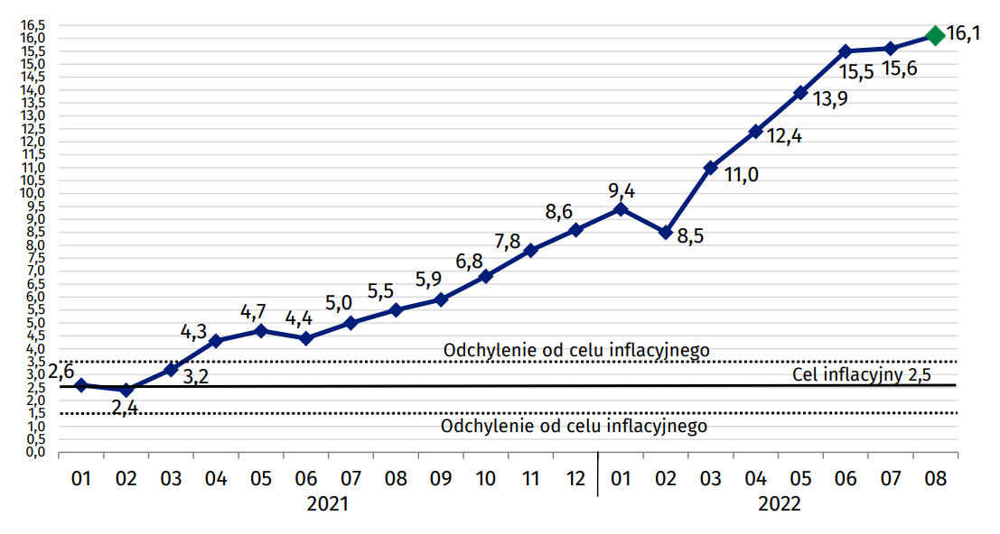 Nowy rekord inflacji oznacza, że w porównaniu z sierpniem 2021 roku ceny są dziś o 16,1% wyższe. Co więcej, jest to wzrost o 0,8% w porównaniu z poprzednim miesiącem. Wtedy wskaźnik cen towarów i usług konsumpcyjnych wyniósł 15,6%. Wydawało się, że być może inflacja osiągnęła szczyt i zacznie powoli hamować, gdyż również czerwcu 2022 roku mieliśmy nieomal ten sam poziom. Dziś wiemy, że był to przedwczesny optymizm podyktowany płonnymi nadziejami.