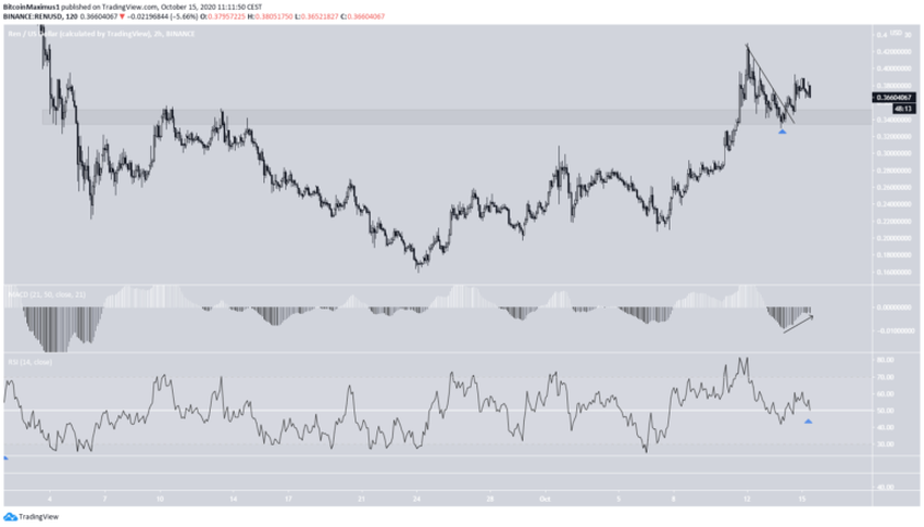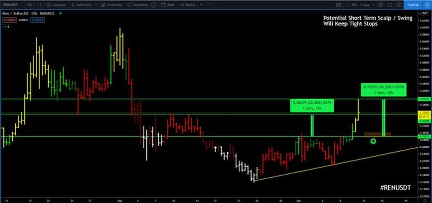 Kryptowalutowy trader @Tradingroomapp opublikował na Twitterze wykres REN, który przedstawia potencjalny wzrost o 36%, co spowodowałoby ruch ceny w kierunku 0,35 i 0,39 USD.