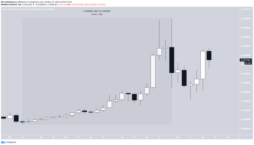 Od początku marca cena REN uległa szybkiemu wzrostowi, którego kulminacją był szczyt na poziomie 0,60 USD, osiągnięty w dniu 1 września. Szczyt przyniósł 2828% wzrostu, mierząc od marcowego minimum na 0,0251 USD.
