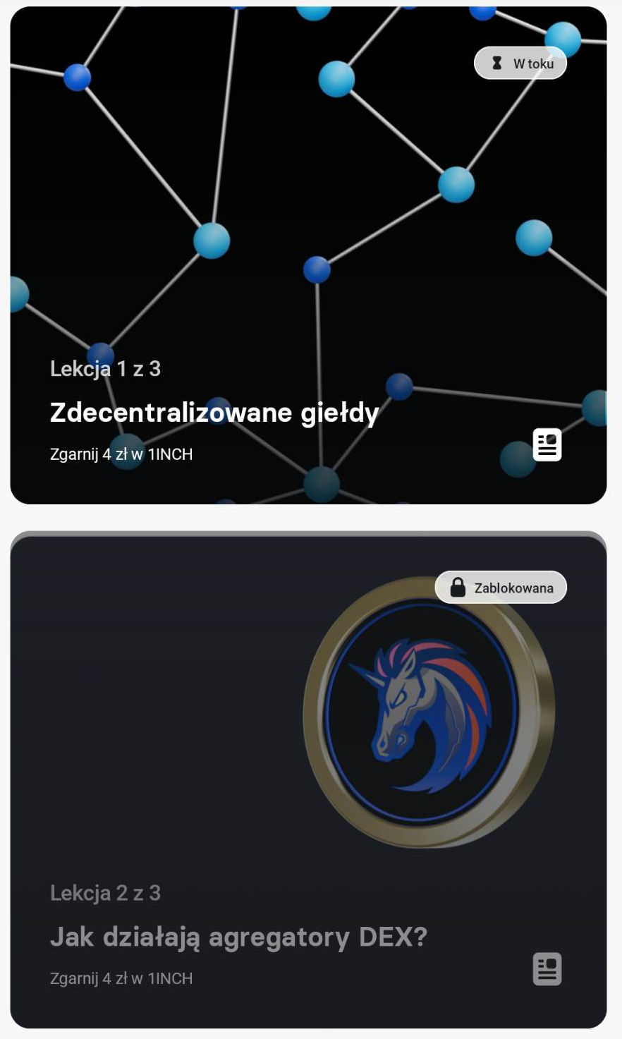 Revolut przeprowadza użytkownika przez 3 filary wiedzy skupiającej się wokół 1inch. Należą do nich zagadnienia związane ze zdecentralizowanymi giełdami, agregatami DEX oraz DAO. Po przeczytaniu fiszek informacyjnych, w każdej z lekcji, użytkownik może przejść do krótkiego quizu, opierającego się na 3 pytaniach. Udzielenie prawidłowych pytań uprawnia użytkownika do otrzymania 12 zł w tokenie 1inch.