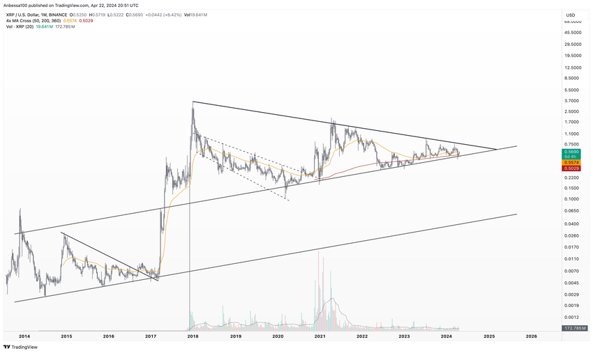 Dodatkowo, na wykresie tygodniowym, XRP konsoliduje się przy kluczowym wsparciu. Według tradera Anbessa, wykres wygląda byczo. Trader napisał: