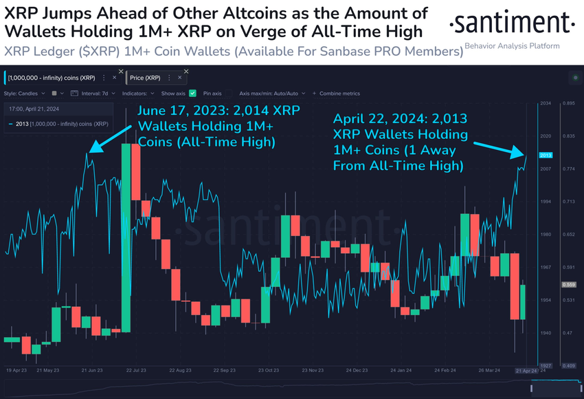 Wraz z dynamiką szerokiego rynku cena XRP odnotowała w tym tygodniu stały wzrost. Co więcej, wzrosła wyżej niż cały rynek altcoinów i wygenerowała ruch w górę o 6%, osiągając szczyt na poziomie 0,56 USD. Trend wzrostowy zbiega się ze wzrostem liczby portfeli posiadających minimum 1 milion XRP. Wskaźnik ten odnotował wartość wyższą o 3,1% w ciągu ostatnich sześciu tygodni. Ruch ten pozycjonuje liczbę portfeli zaledwie o jeden krok od rekordu wszech czasów.