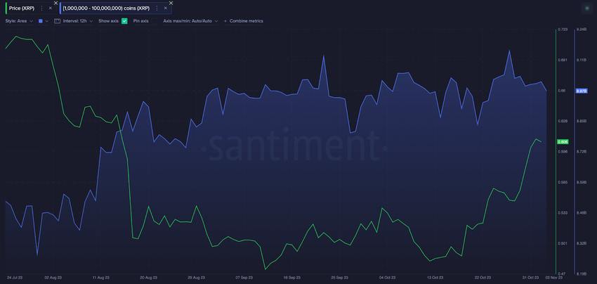 Jak pokazano na poniższym wykresie od Santiment, wieloryby (portfele posiadające od 10 do 100 milionów XRP) zwiększyły swój stan posiadania o kolejne 80 milionów monet w okresie od 21 października do 2 listopada.
