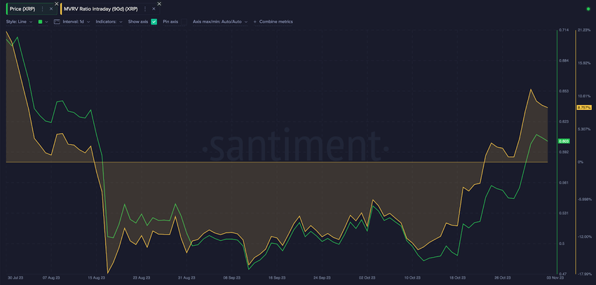 Wykres pokazuje, że po 3-miesięcznym trendzie zakupowym sięgającym początku sierpnia, niezrealizowany zysk inwestorów Ripple zbliża się do dwucyfrowej wartości.