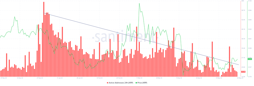 Spadek liczby aktywnych adresów pokazuje, że zmniejsza się liczba posiadaczy. Również to jest niedźwiedzim sygnałem dla ceny XRP.