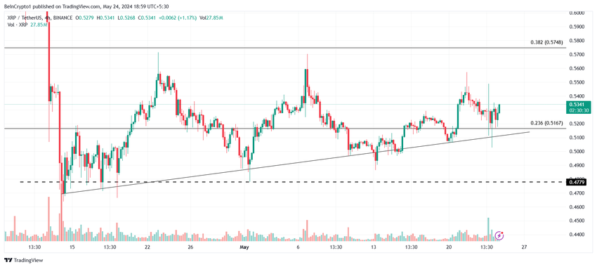 Cena XRP notowana na poziomie 0,53 USD zdołała zabezpieczyć poziom zniesienia 23,6% Fibonacciego jako wsparcie. Poziom ten jest również dolną granicą wsparcia rynku niedźwiedzia, a pozostawanie powyżej niego podczas bessy na rynku zapobiega nadmiernym krachom.