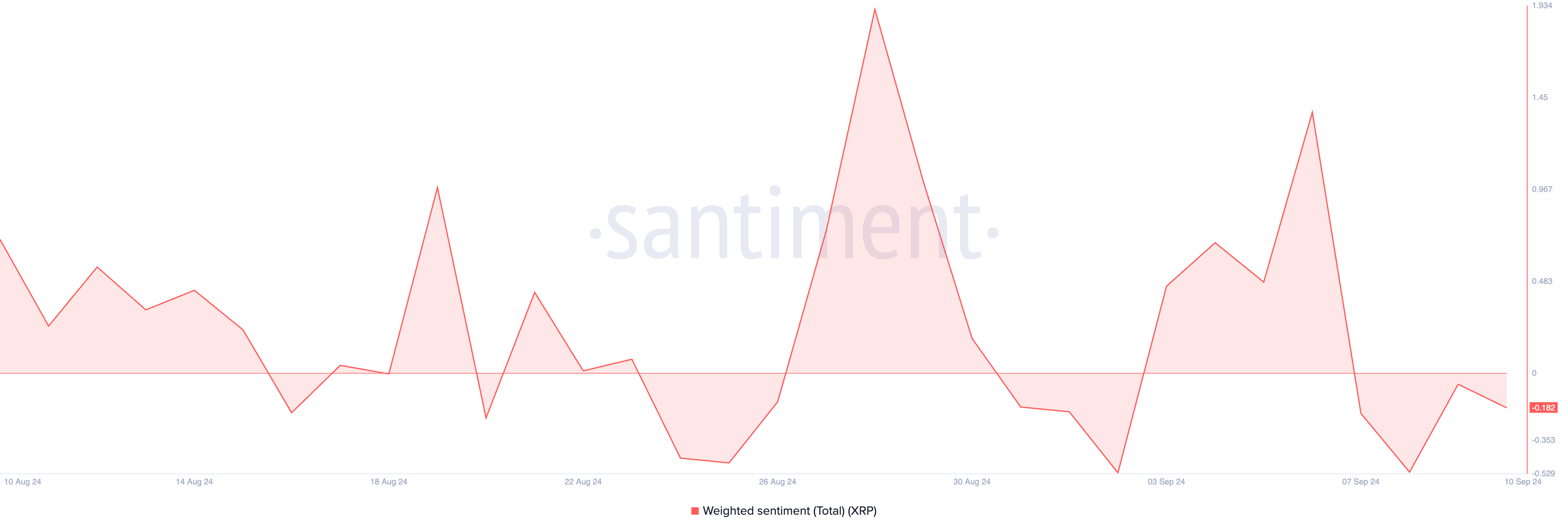 Jednakże Ripple jeszcze nie wyszedł na prostą. Aktywo nadal napotyka negatywne nastroje rynkowe, co odzwierciedla jego ważony wynik sentymentu. Ten obecnie wynosi -0,18.