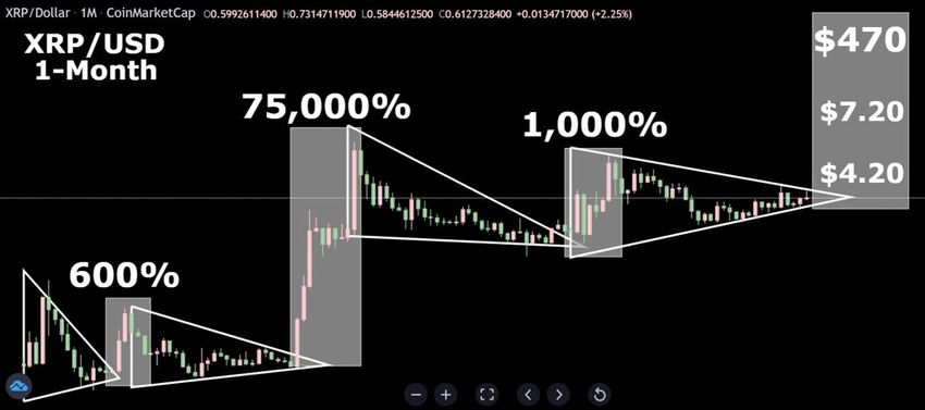 “Prognozowane ceny dla XRP to 4,20 USD, 7,20 USD i 470 USD w oparciu o wybicia z przeszłości. $XRP miał duże wybicie na końcu każdego trójkąta i właśnie kończymy czwarty trójkąt. Wierzysz w to?”