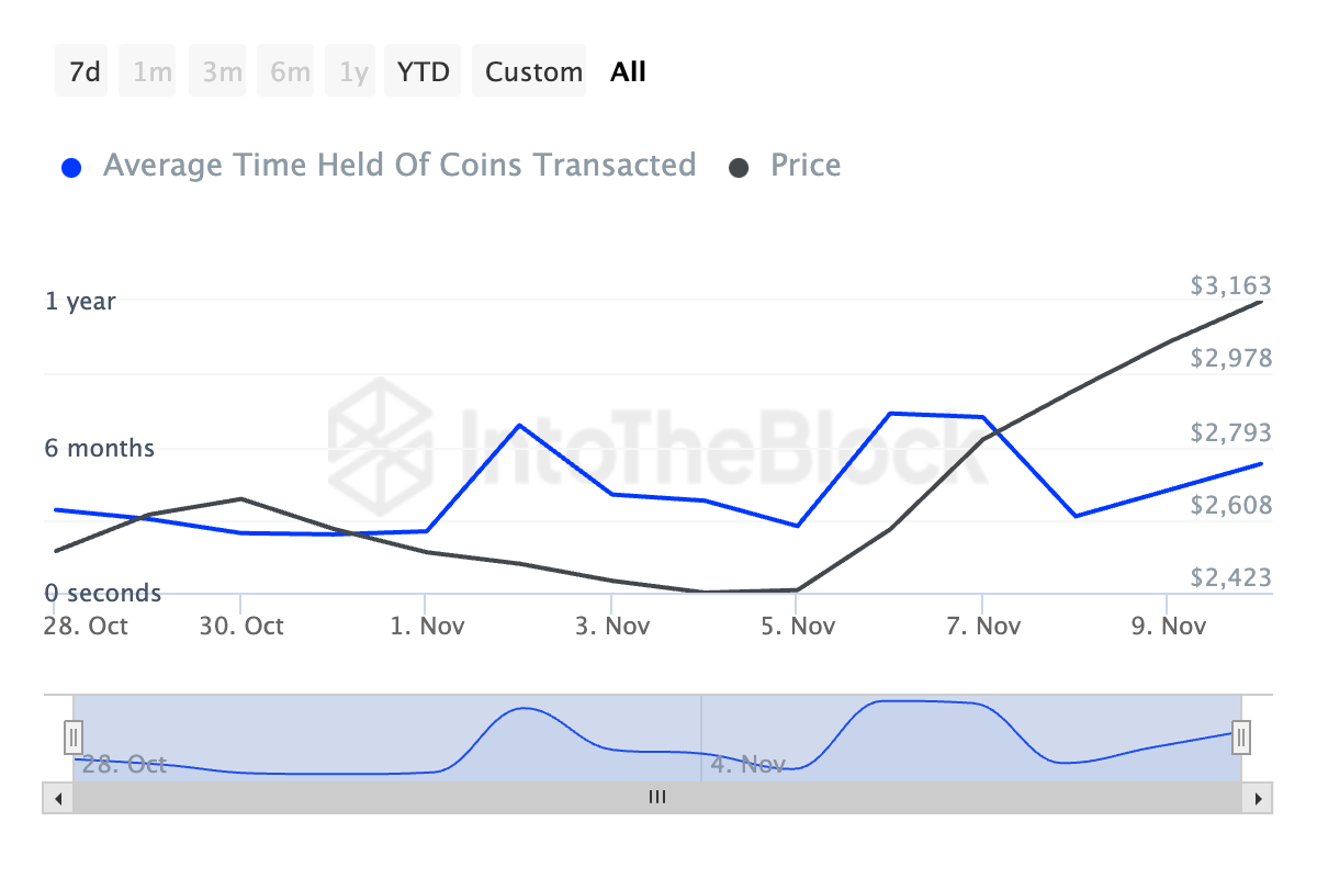 Wskaźnik czasu trzymania monety Ethereum wzrósł o 40% w ciągu ostatnich siedmiu dni. Ten wskaźnik mierzy, jak długo moneta pozostaje na adresie przed jej przeniesieniem lub sprzedażą.