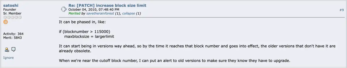 W październiku 2010 r. Satoshi Nakamoto skomentował już możliwość zwiększenia rozmiaru bloków, jeśli zapotrzebowanie na sieć wzrośnie w przyszłości.