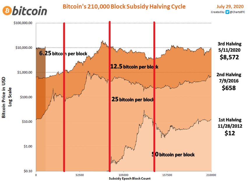 Poszczególne epoki są zaznaczone różnymi kolorami. Oś X wskazuje punkt, w którym kurs poruszał się pomiędzy pierwszym a ostatnim blokiem epoki (każda trwa 210000 bloków). Przebieg pierwszej epoki nie jest kompletny, ponieważ we wczesnych dniach Bitcoina nie istniały zorganizowane giełdy do wymiany kryptowaluty na pieniądze fiducjarne. Według Wikipedii pierwsza możliwa do określenia stawka za 1 BTC wynosiła zaledwie 0,08 centa amerykańskiego.
