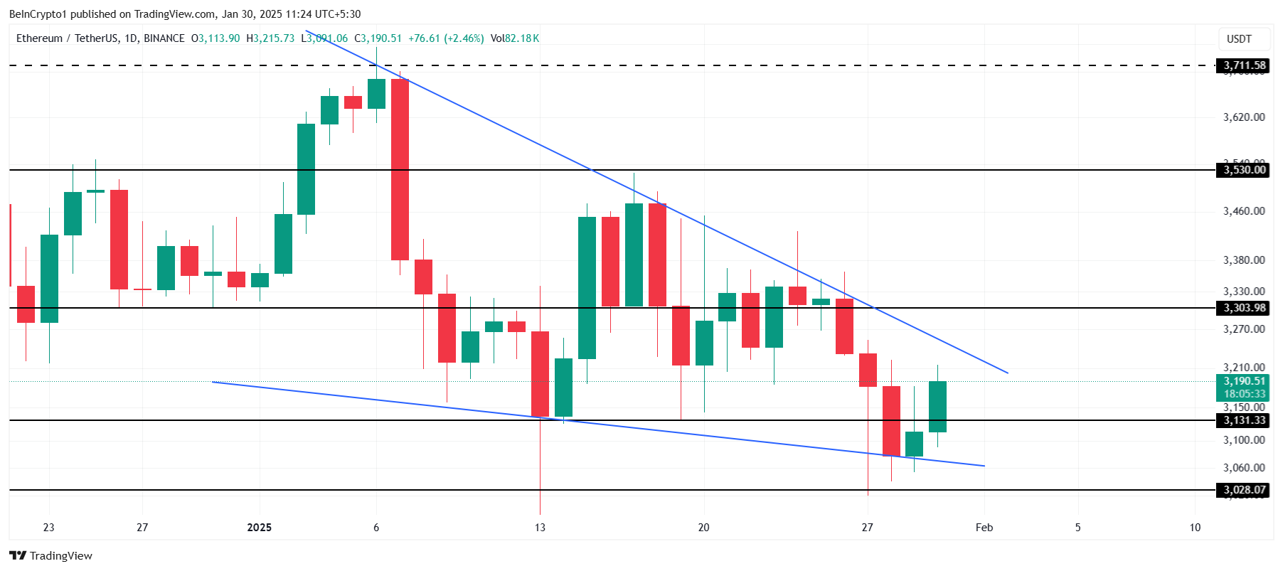 Ostatnie ruchy cenowe Ethereum uformowały formację opadającego klina przez cały styczeń. Wybicie z tej formacji może przesunąć króla altcoinów powyżej krytycznego poziomu oporu wynoszącego 3303 USD. Przebicie tej bariery potwierdziłoby odwrócenie trendu wzrostowego i ustawiłoby kryptowalutę na silniejszej ścieżce odbicia.