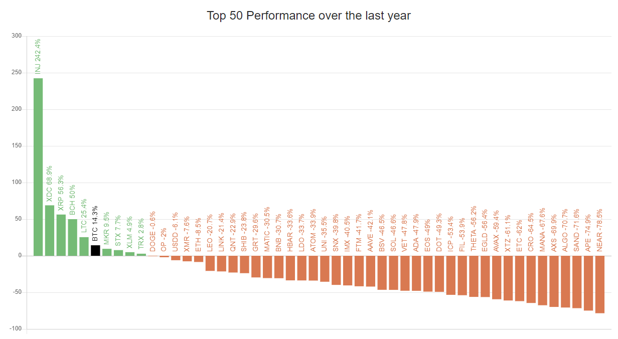Warto dodać, że tylko 5 altcoinów z TOP 50 rankingu kapitalizacji rynkowej może w ostatnim roku pochwalić się większymi zyskami niż BTC. Są to kolejno INJ (242%), XDC (68%), XRP (56%), BCH (50%) i LTC (25%). W tym czasie Bitcoin odnotował wzrost o 14,3% wyprzedzając wszystkie pozostałe 44 altcoiny.