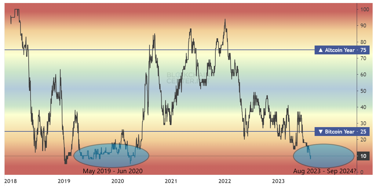 Rynek altcoinów ma za sobą katastrofalny 2022 roku oraz neutralną, lecz budzącą pewne nadzieje, pierwszą połowę 2023 roku. Długoterminowe wskaźniki siły altcoinów względem Bitcoina znajdują się dziś na historycznie niskich poziomach.