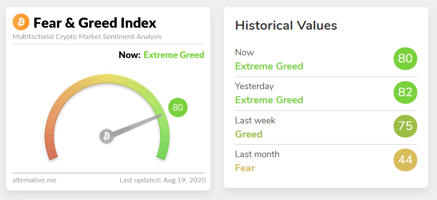 Fear and Greed Index już od kilku dni znajduje się w okolicach ekstremalnej chciwości, powyżej 80 punktów procentowych: