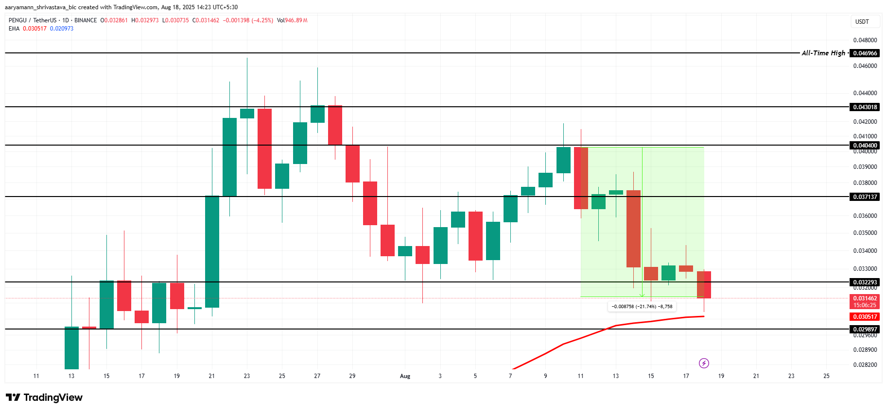 Niemniej jednak, jeśli presja sprzedażowa utrzyma się, PENGU będzie ryzykował spadek poniżej swojego wsparcia na poziomie 0,0298 USD. Strach inwestorów przed stratami mogłaby wywołać dalszą sprzedaż, co może zepchnąć memeciona w kierunku poziomów na 0,0280 USD, co dodatkowo osłabi nastroje rynkowe.