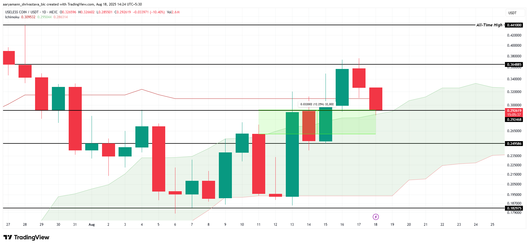 Tymczasem wskaźnik chmury Ichimoku wykazuje byczy impet dla USELESS. Sugeruje on, że moneta może odbić się od poziomu na 0,292 USD. Jeśli ten trend wzrostowy będzie kontynuowany, cena może wzrosnąć do 0,364 USD. To kluczowy poziom oporu. Przełamanie tej bariery jest niezbędne, aby USELESS mógł rzucić wyzwanie swojemu rekordowi wszech czasów na poziomie 0,441 USD.