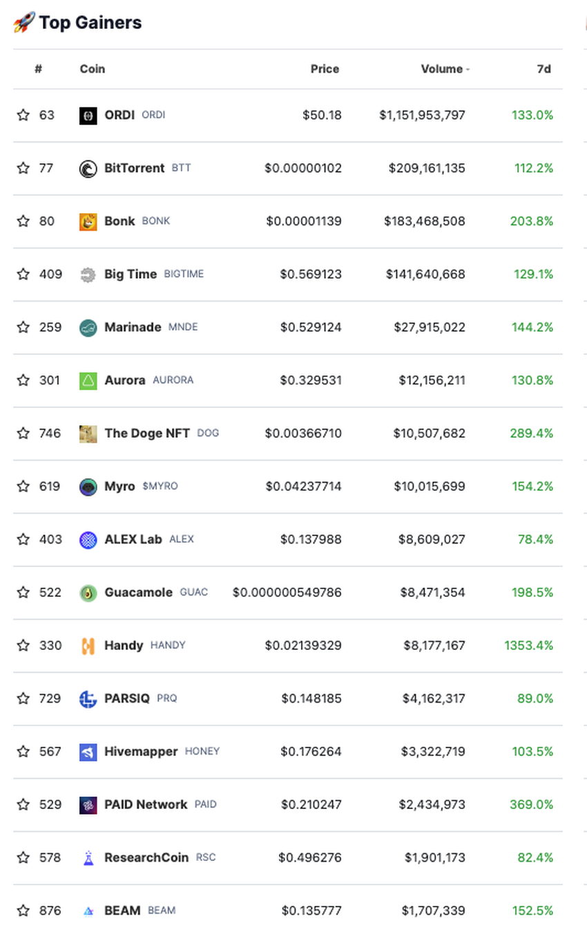 HANDY (HANDY) wzrósł najbardziej i osiągnął wzrost ceny o 1 353,4%. Najwyższy wolumen obrotu wynoszący nieco poniżej 1,15 mld USD odnotowała moneta ORDI (ORDI). Wzrosła ona o około 133%.