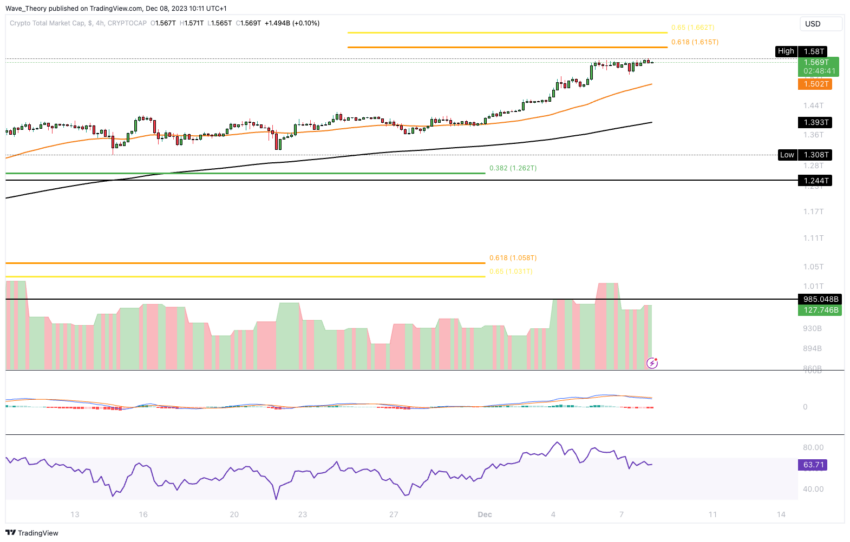 Rynek kryptowalut jest niedaleko od osiągnięcia kapitalizacji rynkowej na poziomie około 1,615 bln USD. Rynek napotyka tam na istotny opór Fibonacciego.
