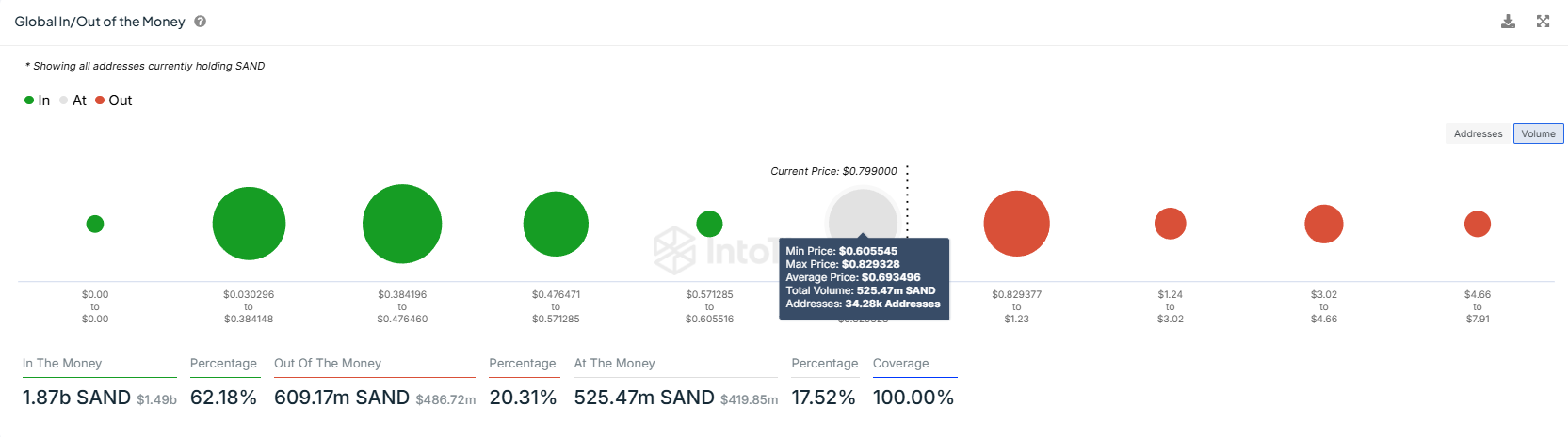 Najnowsze dane z wskaźnika GIOM (global in/out of the money) pokazują, że około 525 mln SAND, o wartości ponad 417 mln USD, zbliża się do progu rentowności. Ta podaż została zakupiona w przedziale cenowym od 0,60 USD do 0,82 USD.