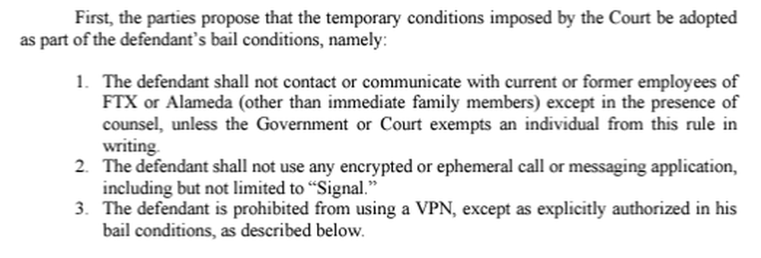 Sędzia Kaplan wcześniej zakazał SBF korzystania z nieautoryzowanych sieci VPN w celu ominięcia wykrycia przez rząd. Zgodnie z warunkami tymczasowymi, Bankman-Fried nie może używać szyfrowanych platform komunikacyjnych do kontaktowania się z byłymi pracownikami FTX.