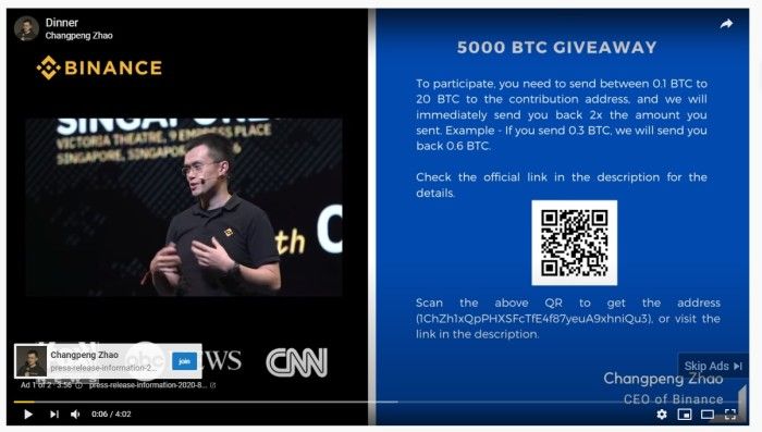 Użytkownicy YouTuba zalewani są kolejnymi falami rzekomych prezentów podarunkowych, w reklamach których wykorzystuje się wizerunki celebrytów lub instytucji. Podszywający się pod akcje promocyjne lub dobroczynne oszuści obiecują zwrot przynajmniej dwukrotności wpłaty na podany w materiale adres. Oczywiście zwrotny przelew nigdy nie następuje, a przekazane środki są już niemożliwe do odzyskania.
