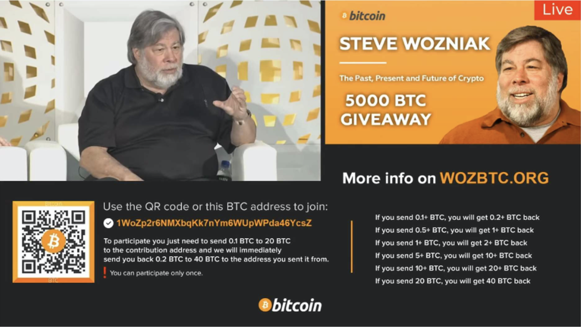 Do promowania takich fałszywych akcji są nielegalnie wykorzystywane wizerunki wielu osób, np. Vitalika Buterina, Steve’a Wozniaka, Elona Muska, Billa Gatesa oraz giełd kryptowalutowych, np. Binance lub Bitmex.