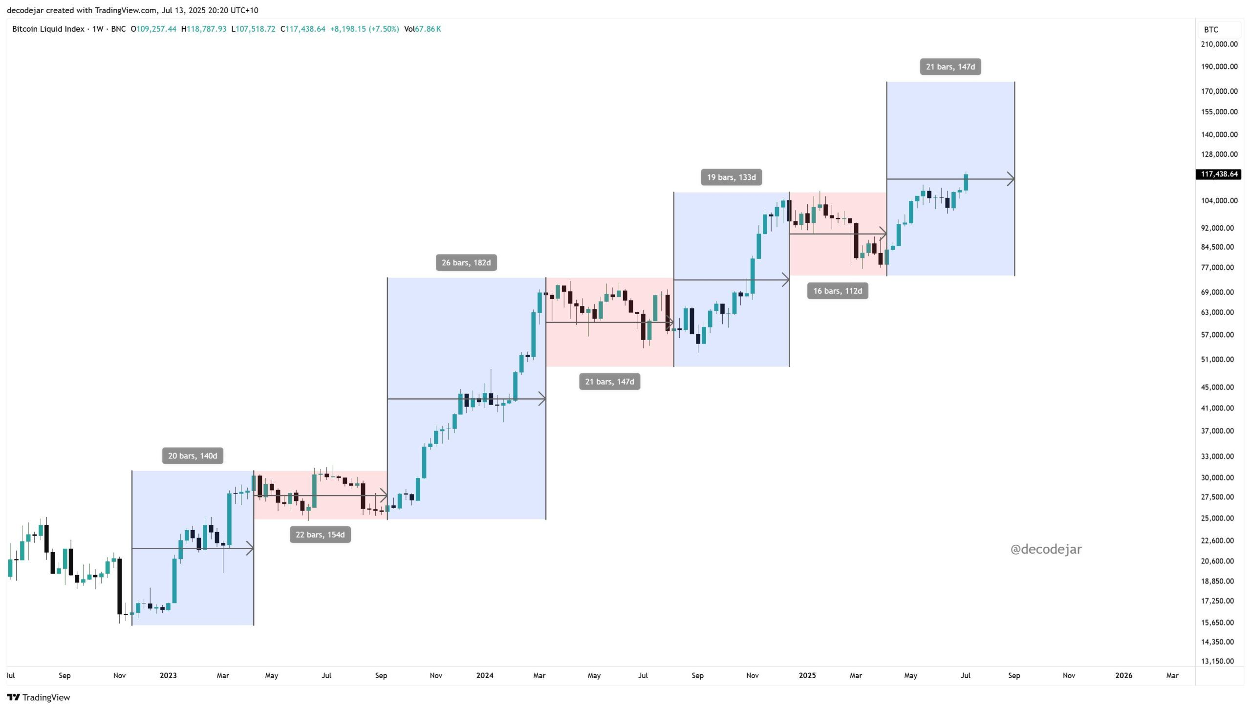 W analizie przygotowanej przez Decode na wykresie tygodniowym widoczna jest powtarzalność w zachowaniu ceny Bitcoina. Historycznie, każda faza wzrostowa trwała średnio 21 tygodni, po czym następował okres konsolidacji o zbliżonej długości. Ten charakterystyczny układ rynkowy zyskał miano schodkowego ruchu Bitcoina.