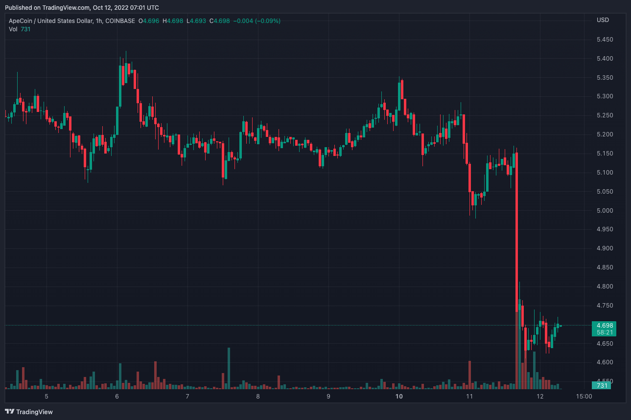 Token APE zareagował na tę wiadomość gwałtownym spadkiem. Aktywo straciło 8,1% w ciągu ostatnich 24 godzin, jak podaje CoinGecko.