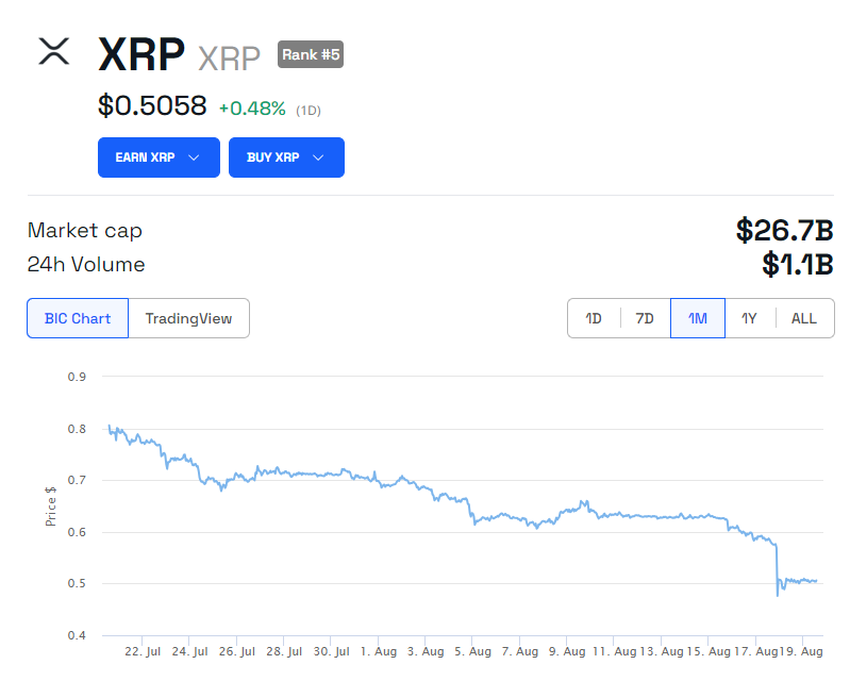 Jednak przyznanie się organu nadzoru finansowego nie wpłynęło na wyniki cenowe XRP. Aktywa wzrosły o 0,48% w ciągu 24 godzin. Były notowane na poziomie 0,50 USD w momencie publikacji, zgodnie z danymi BeInCrypto. W ciągu ostatniego tygodnia gwałtowny ruch na rynku zniwelował wszystkie zyski po zwycięstwie SEC.