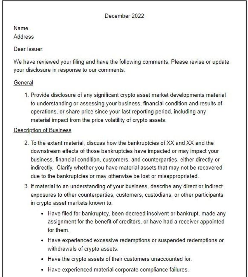 W komunikacie doradzono również, aby sprawdzić, czy ich obecne ujawnienia wymagają rewizji. W szczególności, grupa FTX ogłosiła w listopadzie upadłość w ramach rozdziału 11 w USA. Od tego czasu kilka firm spisało swoją ekspozycję na giełdę. Ponadto globalna kapitalizacja rynku kryptowalut spadła poniżej 900 miliardów dolarów, wymazując bogactwo inwestorów.