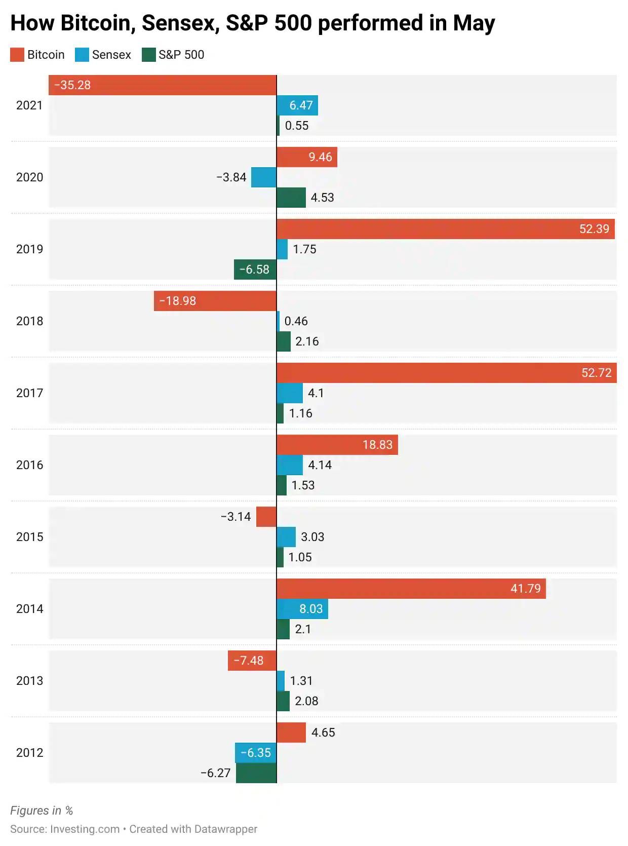 Pierwotna kryptowaluta doświadczyła również w maju kilka korekt. Najgorsza miała miejsce w zeszłym roku. Kurs BTC spadł wówczas o 35,2 procent. Podczas rynku niedźwiedzia z 2018 r. spadek wyniósł 18,9 proc.