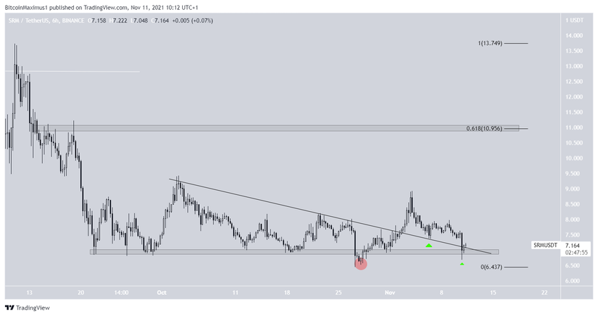 W ciągu ostatnich 50 dni Serum konsolidował się tuż nad obszarem wsparcia przy 6,73 USD. Jest to poziom wsparcia zniesienia 0,618 Fib i horyzontalny obszar wsparcia.