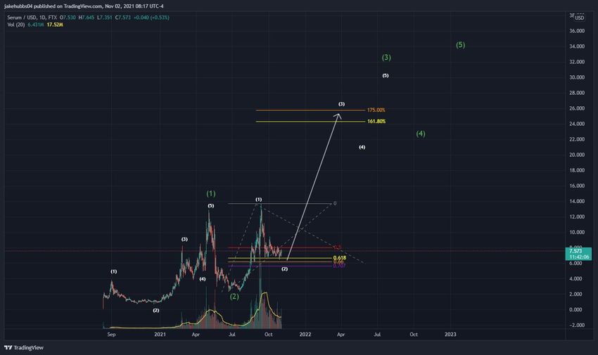 Trader kryptowalutowy @TheTradingHubb nakreślił wykres SRM, pokazując, że rozpoczęła się potężna formacja fali 1-2/1-2, która może doprowadzić do cen powyżej 20 USD.