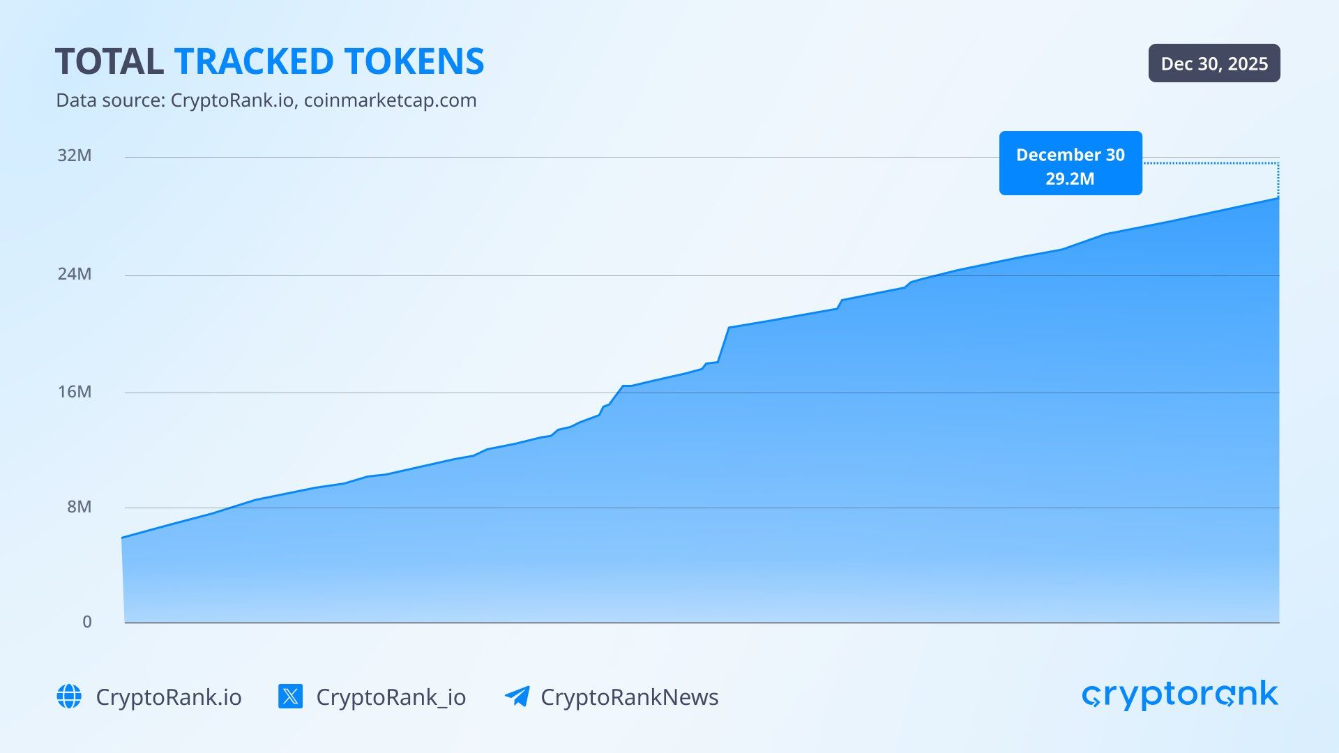 Analiza CryptoRank pokazuje, że rozproszenie kapitału jest największym wyzwaniem dla altcoinów. Liczba śledzonych tokenów wzrosła z 5,8 mln do 29,2 mln w ostatnim roku, przez co środki finansowe rozpraszają się na tysiące projektów. To ogranicza skupione zakupy, niezbędne do szerokiej hossy w tym segmencie.