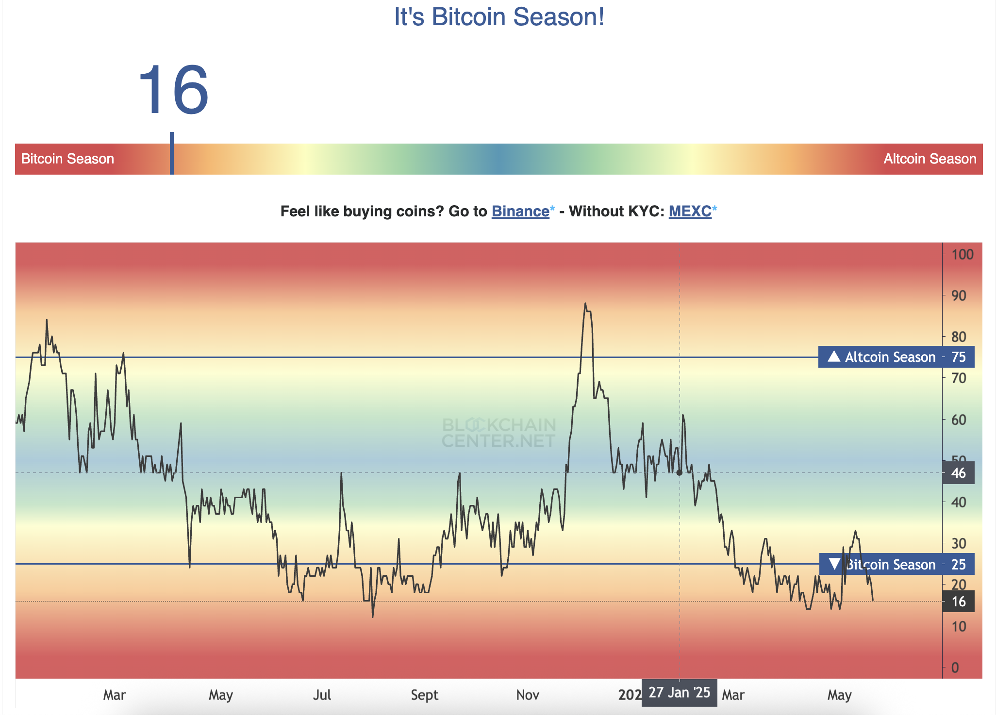 Zgodnie z danymi od Blockchain Center, rynek kryptowalut wykazuje silny “sezon na Bitcoina”. Jest to okres, w którym BTC znacząco przewyższa szerszy rynek altcoinów.