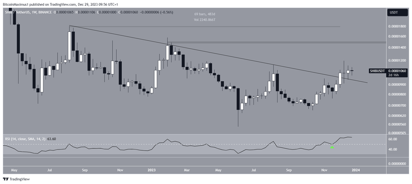 W listopadzie wzrost spowodował, że cena SHIB wybiła się z opadającej linii trendu oporu, która obowiązywała przez 480 dni. Pomimo wybicia, cena SHIB nie wzrosła. Kurs znajduje się raczej bardzo blisko opadającej linii trendu oporu.