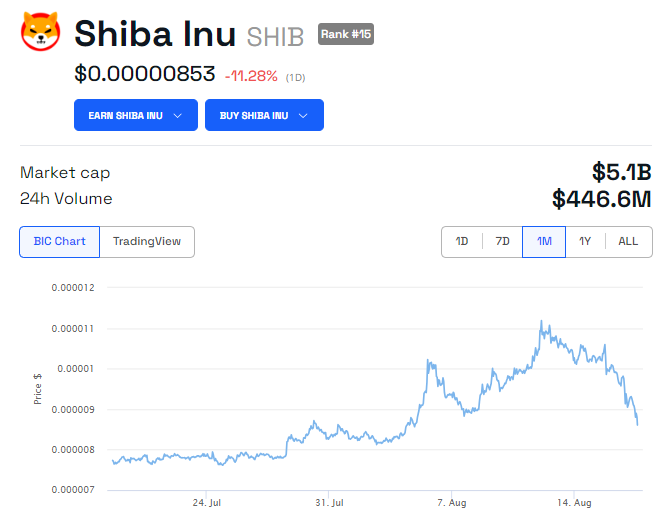Ceny Shiba Inu spadły o ponad 11% tego dnia, co oznacza większy spadek niż ogólny wycofanie się z rynku kryptowalut. W momencie pisania tego tekstu SHIB był notowany po kursie 0,000000853 dolara.