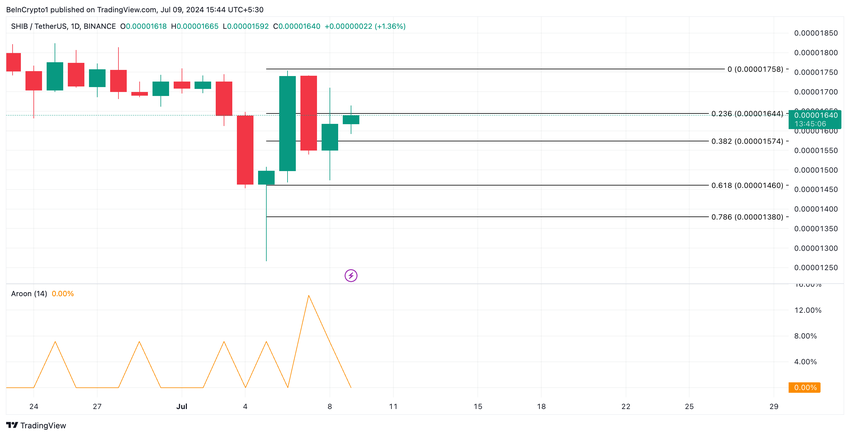 Według linii Aroon Up na jednodniowym wykresie SHIB, obecny wzrost ceny memecoina może być krótkotrwały. Na tę chwilę wartość wskaźnika wynosi 0%.