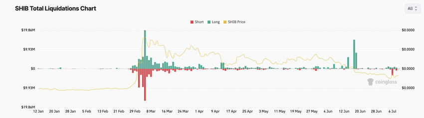 Wzrost ceny Shiba Inu od 5 lipca spowodował więcej likwidacji krótkich niż długich pozycji. W rzeczywistości 6 lipca likwidacje krótkie osiągnęły 3,36 miliona USD, przewyższając likwidacje długie o 491%. To największe jednodniowe straty traderów obstawiających spadki.